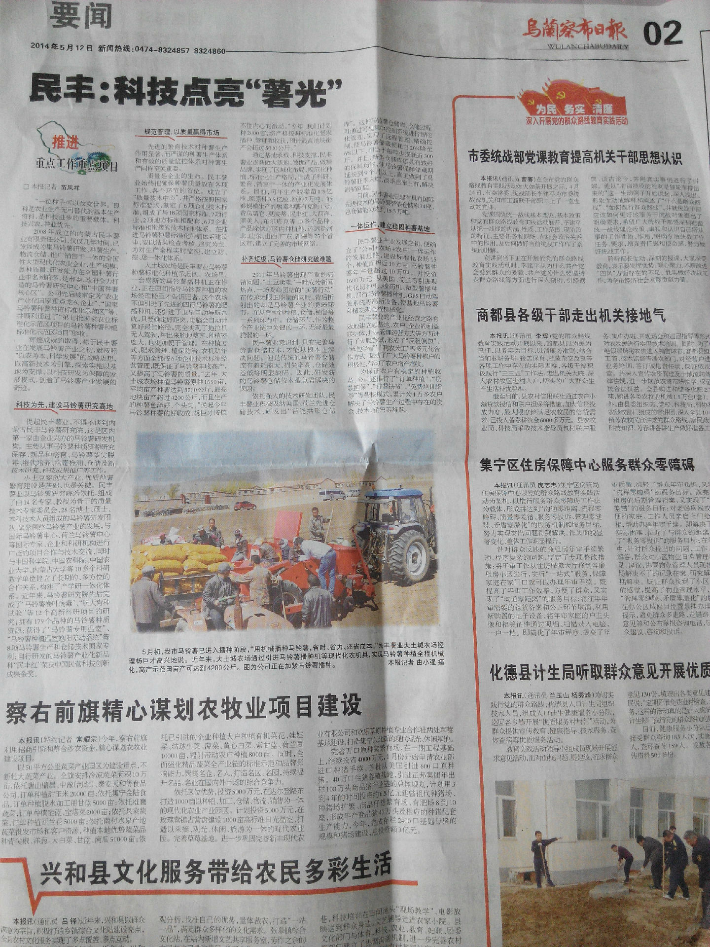 2014年5月12日,烏蘭察布日報發(fā)表《民豐:科技點亮“薯光”》一文。